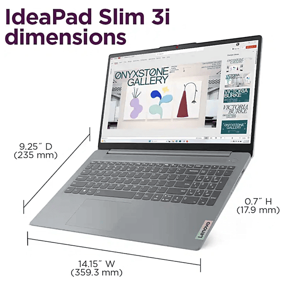 Standing screen display size 15.6 Inches Screen Resolution 1280x720 Max Screen Resolution 1366 Pixels Processor 2.8 GHz celeron RAM DDR4 Memory Speed 2666 MHz Hard Drive 512 GB SSD Graphics Coprocessor Intel UHD Graphics Chipset Brand Intel Card Description Integrated Wireless Type 802.11ax Number of USB 2.0 Ports 2 Number of USB 3.0 Ports 1 Average Battery Life (in hours) 11 Hours Other Technical Details Brand Lenovo Series IdeaPad Slim 3i Item model number IdeaPad Operating System Windows 11 Item Weight 3.5 pounds Product Dimensions 21 x 3 x 14 inches Item Dimensions LxWxH 21 x 3 x 14 inches Color Gray Processor Brand Intel Number of Processors 4 Computer Memory Type DDR4 SDRAM Batteries 1 Lithium Ion batteries required.