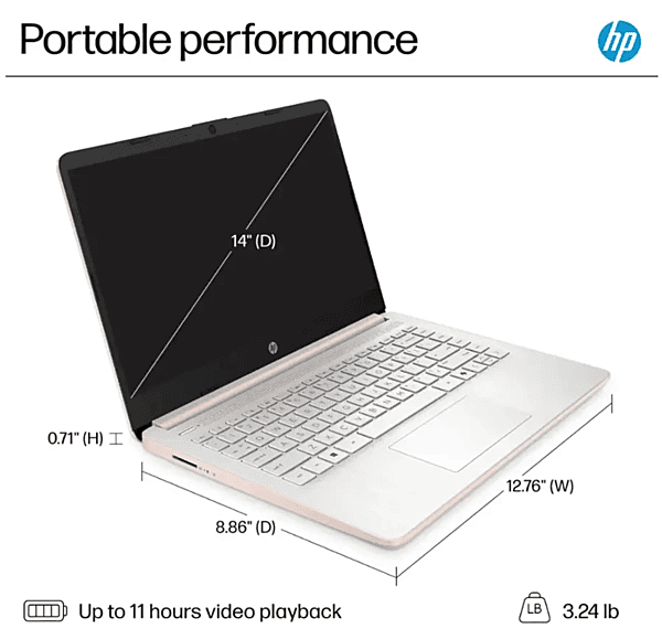 Standing screen display size 14 Inches Screen Resolution 1366 x 768 pixels Max Screen Resolution 1366x768 Pixels Processor 1.1 GHz intel_n RAM 8 GB DDR4 Hard Drive 64 GB SSD Chipset Brand Intel Card Description Integrated Wireless Type 802.11a/b/g/n/ac, Bluetooth Number of USB 3.0 Ports 2 Average Battery Life (in hours) 8 Hours Other Technical Details Brand HP Series 15-1716lcd Item model number 8B3V Hardware Platform PC Operating System Win 11 Home S Mode Item Weight 5 pounds Product Dimensions 14.11 x 9.53 x 0.7 inches Item Dimensions LxWxH 14.11 x 9.53 x 0.7 inches Color Rose Gold Processor Brand Intel Number of Processors 2 Computer Memory Type DDR4 SDRAM Hard Drive Interface PCIE x 4 Optical Drive Type No Optical Drive