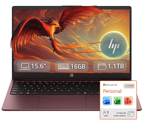 HP Ultrabook 15.6" Laptop, 16GB RAM, 1.1TB Storage (1TB OneDrive + 128GB UFS), Microsoft 365 Included, Intel 4-Core | Fast, Smart, Budget-Friendly, AI-Ready Essential no Mouse, Wine Red