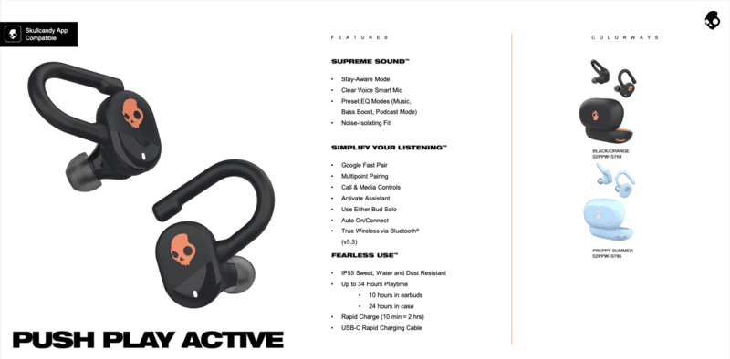 PurposelyCrafted.co is an Authorized SkullCandy Reseller: Stay-Aware Mode • Clear Voice Smart Mic • Preset EQ Modes (Music, Bass Boost, Podcast Mode) • Noise-Isolating Fit • Google Fast Pair • Multipoint Pairing • Call & Media Controls • Activate Assistant • Use Either Bud Solo • Auto On/Connect • True Wireless via Bluetooth® (v5.3) • IP55 Sweat, Water and Dust Resistant • Up to 34 Hours Playtime • 10 hours in earbuds • 24 hours in case • Rapid Charge (10 min = 2 hrs) USB-C Rapid Charging Cable