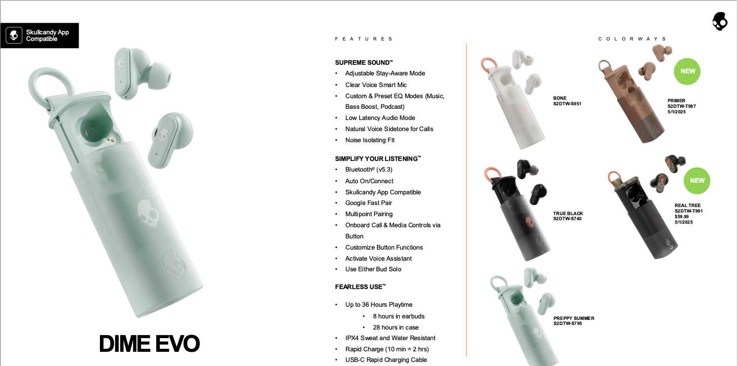 SUPREME SOUND Adjustable Stay-Aware Mode Clear Voice Smart Mic Custom & Preset EQ Modes (Music, Bass Boost, Podcast) Low Latency A udio Mode Natural Voice Sidetone for Calls Noise Isolating Fit SIMPLIFY YOUR LISTENING Bluetooth® (v5.3) Auto On/Connect Skullcandy App Compatible Google Fast Pair Multipoint Pairing Onboard Call & Media Controls via Button Customize Button Functions Activate Voice Assistant Use Either Bud Solo FEARLESS USE Up to 36 Hours Playtime 8 hours in earbuds 28 hours in case IPX4 Sweat and Water Resistant Rapid Charge (10 min = 2 hrs) USB-C Rapid Charging Cable